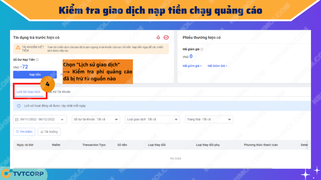 Seller Center >> Kênh Marketing >> Các dịch vụ tài trợ >> Số dư tài khoản >> Chi tiết >> Lịch sử giao dịch